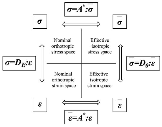 The hypothesis of energy equivalence (see [16,17]) consists of considering the coincidence between the energy stored in the terms of the nominal quantities and secant stiffness and the elastic energy stored in terms of the effective quantities and undamaged linear elastic stiffness. This means that neither the nominal stress, nor the nominal strain are equal to their effective counterparts; therefore, in addition to the relation (2) between the nominal and the effective stress, a relation between the effective and the nominal strain is needed. Following the procedure described in [17], this relation is governed by the fourth-order tensor A introduced in Equation (2) and is written as: