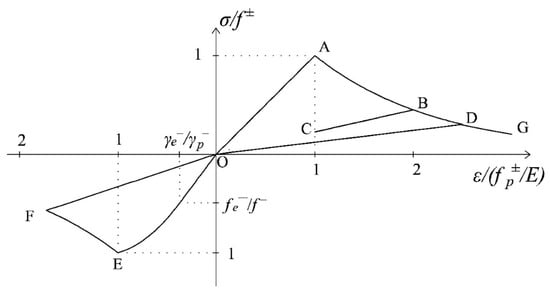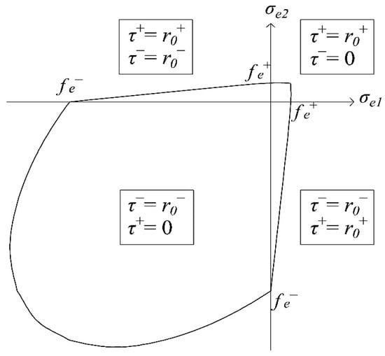 Since the modelling of the plastic strains is outside the scope of the present study, they are assumed equal to zero, and the elastic strain tensor εe adopted in the original model is replaced by the total strain ε henceforth, so that ε = εe. In order to represent the differences between the stress-strain envelops under tension and under compression, two independent scalar variables, one for tension d+ and one for compression d, are introduced. Moreover, to deal with Points (ii), (iii) and (iv), a spectral decomposition of the effective stress tensor (Equation (3)) into a positive and a negative part is carried out: