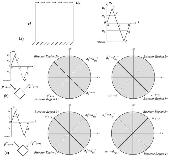 Figure 4. Multidirectional damage procedure in the case of cyclic loading of Type (i): (a) problem statement; (b) identification of the damage regions and damage variables before the load reversal and (c) after the load reversal.