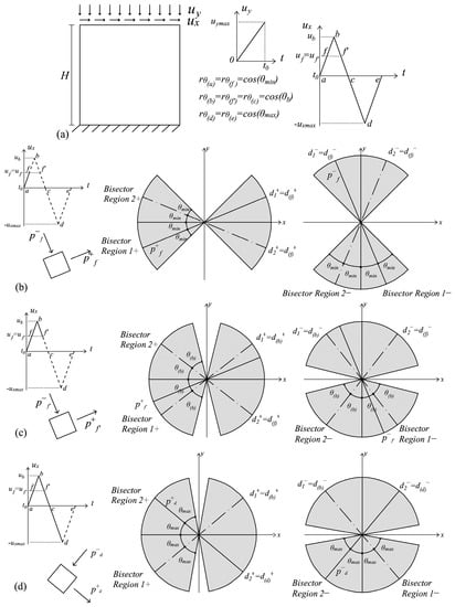 Figure 5. Multidirectional damage procedure in case of cyclic loading of Type (ii): (a) problem statement and identification of the damage regions and damage variables in three different situations: (b) in correspondence with the activation of the multidirectional procedure; (c) in unloading conditions and (d) in loading conditions.