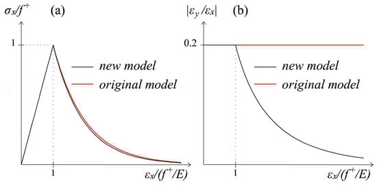 Figure 6. Comparison between the original formulation and the new energy-equivalent model for the problem of a bar uniaxially loaded in tension: (a) σxx curves and (b) the nominal Poisson’s ratio trends.