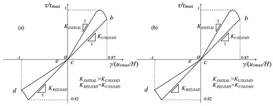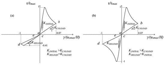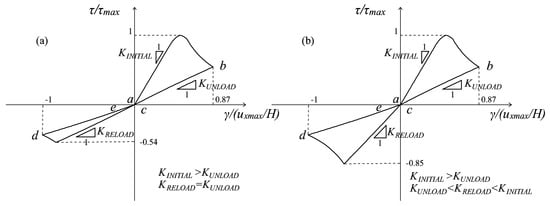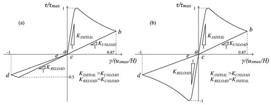 Figure 12. Structural response for the problem represented in Figure 5a, considering a loading history for the horizontal displacement ux composed of five cycles: (a) damage formulation presented in Section 2 and (b) multidirectional damage model.