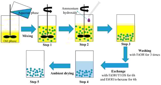 Ammonia hydroxide aqueous solution (2.0 mol/L) was added drop by drop to the emulsion, changing the pH of the system to 8 (Step 2 in Figure 1). The system was agitated for another 20 min, during which silica hydrogel microspheres formed (Step 3 in Figure 1). After agitating, the container with wet gels was sealed, and the gels were aged at room temperature for 1–3 h. The prepared micron-sized silica hydrogel was washed three times after being soaked in an ethanol bath to remove the oil phase. After washing, the silica hydrogel was immersed in a container containing an ethanol/TEOS (3:1 volume ratio) solution for 6 h, and ethanol/n-hexane (3:1 volume ratio) solution for another 6 h (Step 4 in Figure 1). As the solvent exchange reaction proceeded, the water present in the hydrogel was displaced. The displaced water was then removed from the container, and the gel was dried by an oven under an ambient pressure at 80 °C for 6 h. The experimental procedures to synthesize the silica aerogel microspheres are shown in Figure 1. Control samples with surface modification were also prepared by immersing the silica hydrogel microspheres in a container containing HMDSO/TMCS/n-hexane (2:3:15 volume ratio) solution for 8 h and dried under an ambient pressure at 80 °C for 6 h.