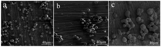 SEM images of the silica aerogel microspheres prepared at different emulsifier concentrations: (a) 0.30 g/mL; (b) 0.50 g/mL; and (c) 0.70 g/mL.