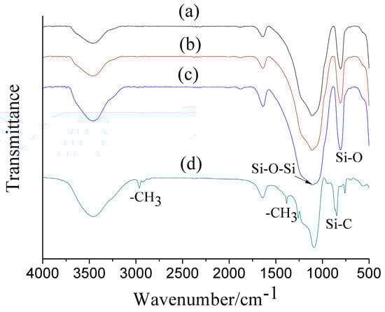 The FTIR characterization results of the surface modified and unmodified silica aerogel microspheres are shown in Figure 7 and summarized in Table 2. There were no obvious differences between the spectras of the unmodified silica aerogel microspheres (Figure 7a–c). The broad peak centered at ca. 3452 cm−1 is attributed to the O–H stretching band of hydrogen-bonded water []. The weak peak at ca. 1641 cm−1 is associated with the physically absorbed water []. The peak at ca. 810 cm−1 is related to the Si–O stretching vibration []. The peak at ca. 1112 cm−1 for Si–O–Si stretching vibration corresponds to the structure of the silica network []. However, the formation of Si–O–Si bonds collapse the pore network of the wet gel due to high capillary pressure []. Figure 7a–c shows the FTIR spectrum of the silica aerogel microspheres synthesized without surface modification, in which hydrogen bonded water (3452 cm−1) and physically absorbed H2O (1641 cm−1) peaks are present, but without Si–C peaks and –CH3 peaks, indicating that the unmodified silica aerogel microspheres are hydrophilic.