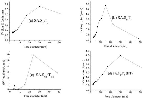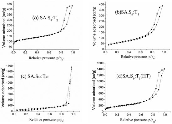 The isotherm of samples SA.S8:T2, SA.S9.8:T0.2, SA.S9:T1, and SA.S9:T1(HT) are Type IV, which is a characteristic feature of mesoporous materials []. The desorption cycles of the isotherms showed a hysteresis loop which is generally attributed to the capillary condensation occurred in the mesopores. The shapes of the hysteresis loops are often identified with the specific pore structures. The adsorption-desorption branches of samples SA.S9.8:T0.2 is almost parallel and vertical over a range of p/p0 showing the H1 type of the hysteresis loop. Such a type of hysteresis loop is often associated with cylindrical pores, with interconnected networks []. The adsorption-desorption branches of samples SA.S8:T2, SA.S9:T1, and SA.S9:T1 (HT) showing the H2 type of the hysteresis loop, and correspond to pores with inkbottle shape [].