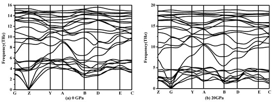 From Table 2, as the mechanical stability criteria of monoclinic symmetry are satisfied, it can be concluded that P2/m-Si is mechanically stable [34]. Meanwhile, the phonon spectra of P2/m-Si was also investigated under different pressures. The phonon spectra should show no imaginary frequencies over the entire Brillouin zone, which indicates that the phase is dynamically stable [35]. The phonon spectra of P2/m-Si at different pressures are shown in Figure 3. The phonon spectra of P2/m-Si shows no imaginary frequencies over the entire Brillouin zone between 0 GPa and 20 GPa, which indicates that P2/m-Si is dynamically stable up to 20 GPa. Above this pressure, P2/m-Si is destabilized, indicating that a structural transformation occurs.