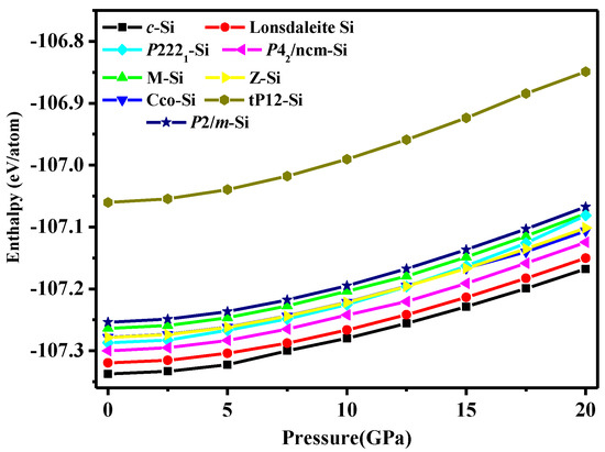 The calculated enthalpies of different silicon structures as a function of pressure.