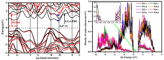 where the HF mixing parameter μ is 0.25 and the screening parameter ω is 0.207 Å−1 [44,45]. The electronic band structure of P2/m-Si was calculated using the GGA-PBE and HSE06 functionals, and the electronic band structures of P2/m-Si are shown in Figure 5a. Figure 5a clearly shows that P2/m-Si is an indirect-band-gap semiconductor with a band gap of 1.51 eV, as determined by the HSE06 hybrid functional. The result calculated by the HSE06 hybrid functional is much larger than the result from the GGA-PBE functional (0.87 eV). In addition, the band gap was found to be higher than that of diamond silicon by 0.23 eV using the same calculation method (diamond silicon: 1.28 eV [11,44]). Moreover, the band gap of diamond silicon calculated by HSE06 is very close to the experimental value (1.12 eV [11,30]). The charge effective mass, which is also a key physical property for applications, can be obtained by the formula m* = h2/(d2E/d2k) in which h is the planck constant, E is energy, k is wave vector. (m*n = 0.023m0, m*p = 0.019m0.). The effective mass reflects the carrier mobility indirectly (μ = qτ/m∗). The experimental effective mass at the Γ valley for a-GaN is 0.2m0 [46], while the effective mass for a hole in a-GaN at the valence band is 0.6m0. Besides, the effective mass at the Γ valley for GaAs is 0.0635m0 at the temperature 300 K [47]. The effective mass at the Γ valley for Ge is 0.038m0 at the temperature 300 K. The averaged light-hole mass in [001] is 0.046m0 [48]. The calculated effective mass of P2/m-Si is much smaller than that of GaN. Therefore, the mobility of P2/m-Si is larger than that of GaN, because the mobility is inversely proportional to the effective mass (μ = qτ/m∗). The electronic mobility of P2/m-Si is close to Ge. The density of states of P2/m-Si is displayed in Figure 5b, and the inset figure illustrates the local features at the Fermi level in detail. The dashed line represents the Fermi level. The DOS is divided into three regions: −13.5 eV to −5 eV, −5 eV to 0 eV and 0 eV to 7 eV. The lowest band ranging from −13.5 eV to −5 eV is characterized by the Si1-s, Si2-s, Si3-s and Si4-s orbitals. The middle band ranging from −5 eV to 0 eV is characterized by the Si1-p, Si2-p, Si3-p and Si4-p orbitals, and the upper band is also characterized by the Si1-p, Si2-p, Si3-p and Si4-p orbitals. In addition, the energy of the upper band is above 0.86 eV.