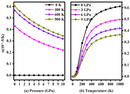 Figure 7 shows the change in the Grüneisen parameter γ with temperature and pressure, where the Grüneisen parameter γ is expressed as γ = −(dlnΘ(V)/dlnV) [49], where Θ is the Debye temperature and V is the volume. This parameter describes the anharmonic effects in the lattice vibrations [38]. As seen in Figure 7a, the γ parameter reduces by 0.045 per GPa, and the values are very close at different temperatures. In other words, the effect of pressure on the Grüneisen parameter γ is greater than that of temperature. As seen in Figure 7b, the γ parameter is not very sensitive to temperature. As the temperature increases to 1000 K, the Grüneisen parameter γ only increases by 0.02 at 6 GPa and 0.01 at 7 GPa or more.