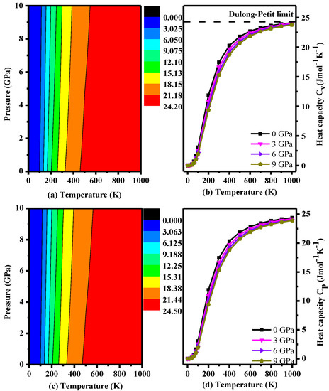 where n is the number of atoms per formula unit, Θ is the Debye temperature, k is Boltzmann constant and D (Θ/T) represents the Debye integral [38]. As seen in Figure 8, the difference between CP and CV is very small. In addition, the trend is basically consistent with the trend at different pressures. Both plots increase as the temperature increases. It is obvious that the heat capacity is sensitive to temperature when T < 500 K; however, the magnitude of the increasement becomes very small when the temperature is over 500 K. In addition, the effect of pressure on the heat capacity is very small. CV stays close to constant at the Dulong-Petit limit (24.92 J·mol−1·K−1) [38] at high temperature and high pressure. Thus, the heat capacity of P2/m-Si is mainly affected by the temperature, and the effect of the pressure is small compared to that of the temperature.