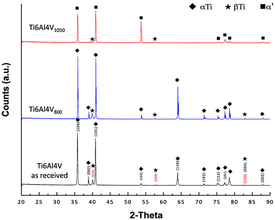 Figure 2 shows diffraction patterns obtained for the three alloys tested. All reflections of αTi and βTi can be observed for Ti6Al4V as received and Ti6Al4V800; whereas α’ (acicular α) is generated for Ti6Al4V1050 alloy [40]. Also, β-phase is observed to a smaller extent for the three materials, retained after the treatment at 38.88°. This phase remains stable in the alloy as a result of the redistribution of alloy elements (Al and V) during the cooling [41,42]. In general, the composition of the Ti6Al4V alloys after different heat treatments is mainly α-phase with a small amount of β-phase [43], with these alloys exhibiting different microstructural features (Figure 1); an acicular type for the Ti6Al4V1050 alloy, as opposed to grains for Ti6Al4V as received and Ti6Al4V800 alloys.