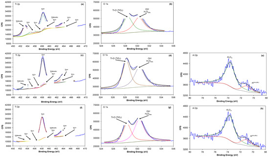 Figure 3 compares high-resolution XPS spectra of Ti 2p, O1s and Al 2p obtained on the surface of Ti6Al4V alloy, as received and with different heat treatments. The Ti 2p spectra (Figure 3a,c,f) can be fitted with four doublets and different binding energies. The first doublet, located at 453.7 and 460.3 eV is associated with the presence of Ti in the metallic state (TiMetallic); the second, at 454.7 and 460.2 eV, may be assigned to the presence of TiO (Ti2+), and the third, at 457.4 and 464.2 eV, reveals the presence of Ti2O3 (Ti3+). The doublet with the highest intensity is observed at 458.4 and 463.6 eV, which could be attributed to the presence of TiO2 (Ti4+). These titanium oxides make part of a thin passive layer (a few nm thick) formed after the sterilization process at the outermost surface of the alloy.