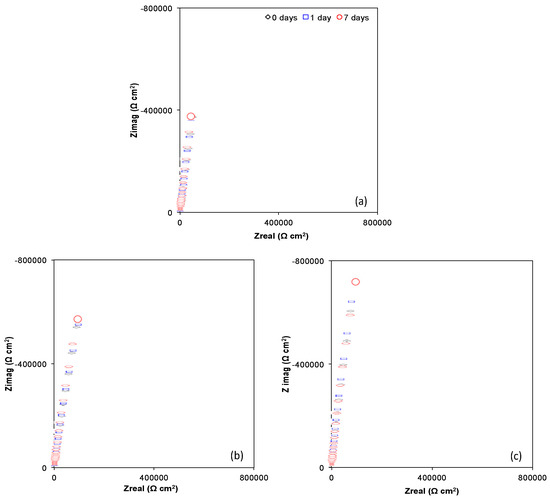 Nyquist plots (Zimag vs. Zreal) of the (a) Ti6Al4V as received; (b) Ti6Al4V800 and (c) Ti6Al4V1050 with the time in the culture medium with osteoblasts cells.