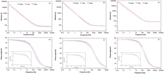 Bode plots (Modulus vs. Frequency and |Z| Phase angle vs. Frequency) recorded for Ti6Al4V as received (a,d), Ti6Al4V800 (b,e) and Ti6Al4V1050 (c,f) through the immersion time in the culture medium with osteoblasts cells.