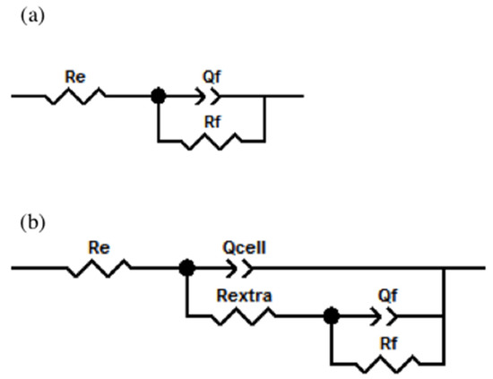 Taking into consideration that the cell interaction until their confluence on the metallic surface (quasi-total surface coverage by cells) occurs locally, the impedance responses might be simulated considering a partially-covered surface. Impedance plots were fitted considering equivalent circuits shown in Figure 7. For the initial time given in Figure 7a, we have considered a circuit, RC, composed of electrolyte resistance Re; a constant phase element Qf, which simulates a non-linear behavior of the capacitor due to the passive film formed by the oxide and adsorbed proteins; and the resistance associated with this film, Rf. Figure 7b exhibits the equivalent circuit used to simulate EIS plots for 1 and 7 days of immersion in osteoblast culture. In this case, the elements associated with the resistance and non-ideal capacitance of the extracellular matrix and osteoblasts, Rextra and Qcell have been considered as well. It was carried out the fitting of the EIS diagrams and the results are given in Table 2.