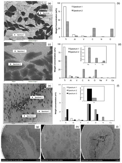 Overview of osteoblasts adhered and EDX analysis to Ti6Al4V as received (a,b,g), Ti6Al4V800 (c,d,h) and Ti6Al4V1050 (e,f,i) after 7 days of immersion in DMEM at 10% of FBS.