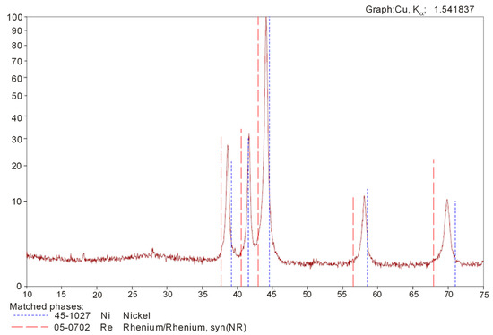 - The thermal reduction of anhydrous nickel(II) perrhenate under the adopted conditions allows the production of Re-Ni alloy powder containing: 13.6% Ni, 86.4% Re, <0.0005% Ca, <0.0005% K, <0.0005% Mg, <0.0005% Cu, <0.0005% Al, <0.0005% Cr, <0.0005% Mn, <0.0005% Na, <0.0005% Mo, <0.0005% Co, <0.0005% Pb, <0.0005% Fe, <0.002% C, <0.0002% Zn, <0.0002% As, and <0.0002% Bi.