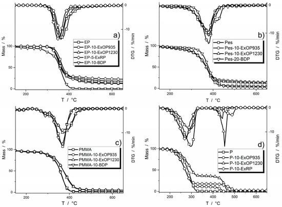 All investigated systems, with and without flame retardant, were investigated via thermogravimetric analysis in the absence of oxygen. Mass and DTG curves are displayed in Figure 1 and results are listed in Table 2.