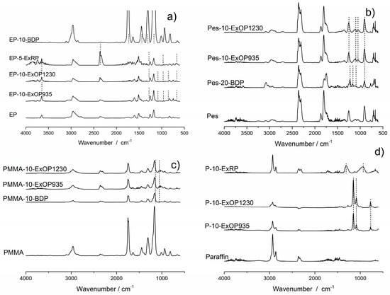 Fourier transform infrared (FTIR) spectra at the respective main decomposition step of flame retardants in: epoxy (a); polyester (b); PMMA (c); and paraffin (d) systems. Dotted lines were included as an aid to highlight smaller peaks from phosphorus species.