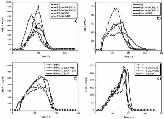Forced flaming fire tests were conducted in the cone calorimeter. At first, it was interesting to see the differences between the investigated flame retardants at the same concentration in different matrices. The heat release rate (HRR) curves are displayed in Figure 3. The results of all cone calorimeter measurements are summarized in Table 3.