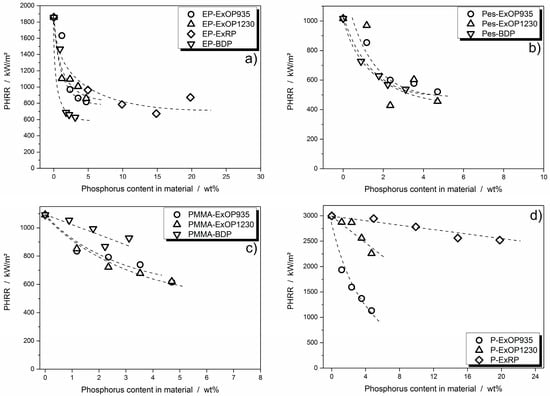 Peak of heat release rate (PHRR) of epoxy resin (a), polyester resin (b), PMMA resin (c) and paraffin (d) systems plotted against amount of phosphorus in the bulk material. The dotted lines are included as guides for the eye analogous to the findings from Brehme et al. for comparable materials [31].