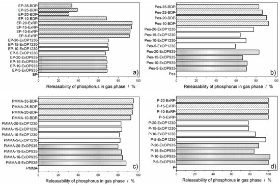 Bar graphs of the percentage of phosphorus released in the gas phase during combustion for epoxy resin (a); polyester resin (b); PMMA resin (c); and paraffin (d) formulations.