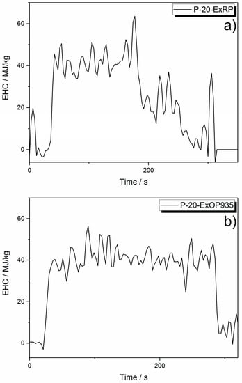 Effective heat of combustion: for P-20-ExRP exhibiting a two-part progression (a); and for P-20-ExOP935 as an example for a constant EHC (b).