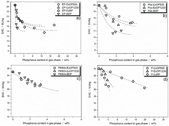 Overall, it is demonstrated that phosphorus release is controlled by the polymer matrix, the phosphorus species itself and the concentration of phosphorus in the specimen. To learn about the way flame inhibition is influenced by the amount of phosphorus release into the gas phase, the effective heat of combustion (EHC) is plotted versus phosphorus concentration in the gas phase (Figure 7). The EHC measured by the cone calorimeter includes the effective heat of the combustion of the volatiles multiplied by the combustion efficiency of the flame, and thus is a measure for the efficiency of a flame retardant in terms of flame inhibition and gas phase activity in general.