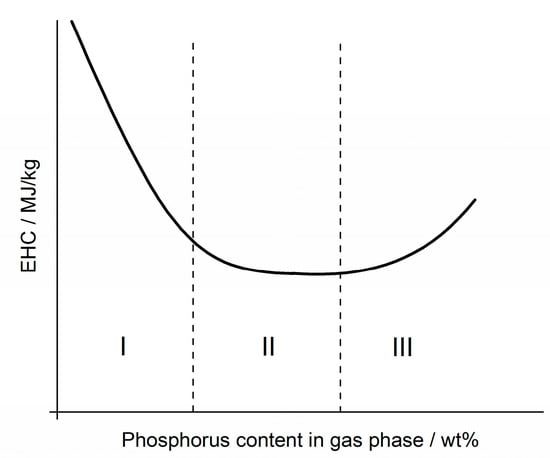 As seen in Figure 7a especially, the curve progression of EHC levels off with increasing phosphorus content in the gas phase. The model curve in Figure 8 is proposed as a basis for the following discussion and is based on findings in previous works [31,43], in which the EHC first dwindles in a linear fashion (I), up to a certain level where the effectiveness in EHC reduction levels off (II). This effect is very prominent in epoxy resin, and less pronounced in the polyester system. The phase is described as (III) in Figure 8, which depicts an increase in EHC with even higher amounts of phosphorus in the gas phase. This converse effect occurs due to increased burning of the phosphorus species without exhibiting any flame inhibiting effect.