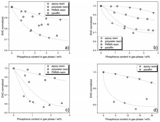Additionally, the effective heat of combustion depending on phosphorus content in the gas phase was checked by comparing the different polymeric matrices flame retarded with the same flame retardant. This enables to make a statement about which flame retardant is most effective in which system. Since all systems exhibit different initial values for the non-flame retarded equivalent, the EHC had to be normalized in order to compare the effectiveness. The results of the comparisons are shown in Figure 9.