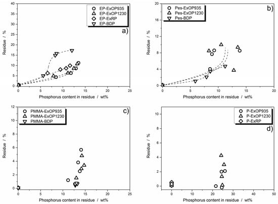 Residue plotted against the phosphorus content in the residue: DGEBA/IPDA (a); polyester (b); PMMA (c); and paraffin (d) system.
