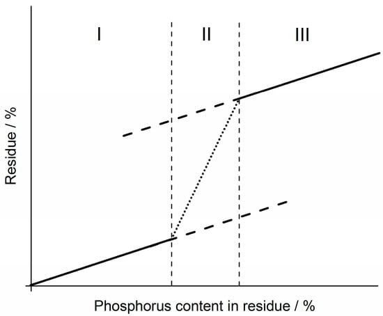Proposed progression of residue formation with increasing phosphorus in the residue. The curve is divided into: an approximately linear phosphorus-residue relation (I); an area of inflection of the curve (II); and a continuous increase of residue with phosphorus content after the inflection point (III) [45].