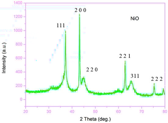 In the MM, microwave energy was used to trigger nucleation growth of nickel nitrate and plant extract, Ni cations within a very short time, to form nanocrystalline fine particles, which were homogeneously dispersed. The results confirmed that the microwave method approach is fast and easy, and results in well-formed crystalline nanomaterials within a few minutes, without the need for calcination. NiO nanostructures have been synthesized by a microwave approach in the presence of olive oil, with a NiO nanoparticle size range of 10–20 nm [38]. Nickel oxide nanoparticles with a size of 25 nm have also been synthesized via a decomposition method [39].