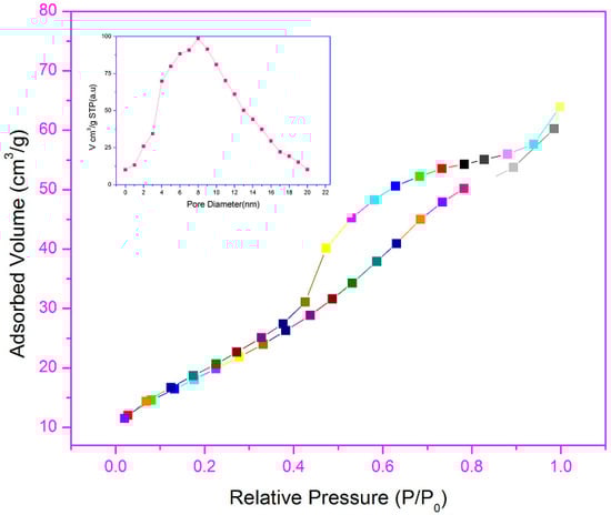 Full nitrogen absorption/desorption isotherm distribution curves of NiO are shown in Figure 4. Nickel oxide-specific surface areas (SBET) composed within pore radius (Rp) and pore volume (Vp) were calculated. The nickel oxide prepared by the MM had a surface area of 60.35 m2/g, a pore volume of 0.9427 cm3/g, and an average pore diameter of 13.27 Å. Hence, it was assumed that the high surface area of nickel oxide could allow for catalytic activity. From the Barrett-Joyner-Halenda (BJH) pore size distributions (inset in Figure 4), we found that all the studied samples showed a single peak in BJH pore size distributions.
