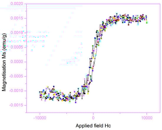 Figure 5 shows that nickel oxide produced material with high organizational structure at a low temperature (5 K). Magnetization using an external applied magnetic field ranging between 0 and ±5000 Oe was applied. As clearly shown, the difference of magnetization as a function of the applied field produced a contracted cycle, and the experimental hysteresis loops gave a representative performance of soft magnetic materials. The saturation magnetization (Ms), remanence magnetization (Mr), and the coercivity (Hc) values of these ferrites were 65.23 (Ms) emu/g, 9.21 (Mr) emu/g and 60.34 (Hc) Oe, respectively. It is well known that the magnetic properties of any nanomaterial are strongly dependent on the preparation method, the shapes and sizes of their particles, and their crystallinity [28,29].