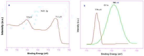 The oxidation state of Ni, its arrangement, and the purity of the synthesized NiO were additionally investigated with the help of X-ray photoelectron spectroscopy (XPS) analysis. The resolution spectrum of Ni 2p is given in Figure 6. The nickel 2p orbital spectra at Ni 2p 3/2 and 2p 1/2 produced binding energy values of 725.8 eV and 711.4 eV, respectively; 779 eV and 785 eV were obtained from the spectra oxygen 1s orbital. These XPS results indicated the formation of nickel oxide.