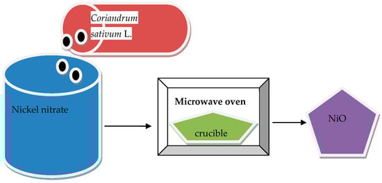 Several soft chemistry processes, such as co-precipitation, sol-gel, hydrothermal, molten salt synthesis, and pyrolysis methods, for covered precursors of double hydroxide and many coordination compounds, have been developed for the preparation of nickel oxides [8,9,10,11,12,13]. Currently, the plant-extracted microwave method (MM) route has attracted significant interest in fabricating homogeneous, nano-sized, functional materials because of its cheap and inexpensive precursors and short preparation time [14,15]. This organic precursor provides a basis for redox reactions to occur during combustion methods. Amongst the numerous controller limitations in a combustion method, fuel plays a large role in determining the morphology and phase formation of the final product. The end product surface area, distribution size and particle accumulation mainly depends on the combustion temperature, which is related to natural fuel and fuel-to-oxidant-dependent ratios. Most recently, plant extracts have also been used as both a reducing and a gelling agent for the synthesis of mixed metal oxides. The plant extract plays a role as a fuel, and also has an organizing action, apprehending the metal ions present in the amylose helix of the plant extract, and obstructing the separation of metal oxides synthesized through the green method, which has been reported previously [14,15,16,17,18,19].