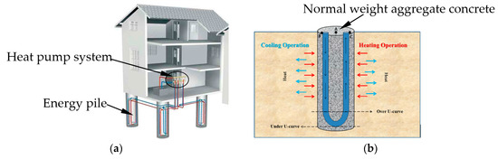 Energy pile application in building energy efficiency. (a) Schematic drawing of geothermal piles system [14]; (b) Heating/cooling operation of energy piles during summer/winter modes [15].