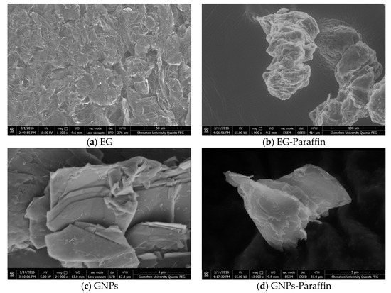 The SEM micrographs of EG, GNPs, EG-Paraffin CPCM, and GNPs-Paraffin CPCM are shown in Figure 2. Paraffin was held by a honeycomb network of EG due to capillary and surface tension forces while it was held by flaky GNP particles (Figure 2c,d) due to their tendency to absorb organic materials on their surface [26].