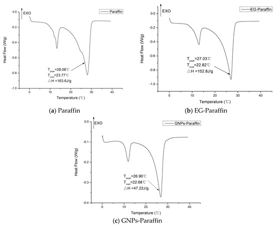 DSC curves—Paraffin and CPCMs. (a) Paraffin (b) EG-Paraffin and (c) GNPs-Paraffin.