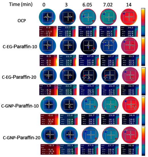 The results of the surface temperature distribution of cement paste with and without CPCMs at various times are shown in Figure 5, while the temperature difference between cement pastes with and without CPCMs is tabulated in Table 4. In general, the surface temperatures of specimens incorporated with CPCMs are lower than ordinary cement paste (OCP) at different stages. This phenomenon exactly illustrates the thermal control capacities of cement pastes combined with CPCM. At 6.05 min, the two specimens (C-EG-Paraffin-10 and C-GNP-Paraffin-20) simultaneously reached peak temperatures. From the DSC test, it is known that the peak temperature of EG-Paraffin and GNP-Paraffin is 27.03 °C and 26.9 °C, respectively. It means that C-EG-Paraffin-10 and C-GNP-Paraffin-20 absorb the same amount of thermal energy from 0 to 6.05 min. In fact, the quantity of paraffin in C-EG-Paraffin-10 (9.3 wt %) and C-GNP-Paraffin-20 (6.2 wt %) is different. This shows that the lower quantity of PCM in C-GNP-Paraffin-20 can have a similar capacity of controlling temperature when compared to C-EG-Paraffin-10. The reason for this is believed to be a different thermal conductivity coefficient of EG and GNP. According to [33], the thermal conductivity coefficient of graphene is as high as 3000–5000 W/(m·K), while, in contrast, the thermal conductivity coefficient of expanded graphite is about 500 W/(m·K), i.e., the thermal conductivity coefficient of GNP is about 6–10 times higher than that of EG. This means that the higher thermal conductivity coefficient of GNP makes the PCM in GNP-Paraffin absorb the heat efficiently. It can also be seen from Table 4 that the heat absorption capacity almost reaches the maximum value at 6.05 min, i.e., the surface temperature of specimens did not change much from 6.05 to 7.02 min. This is due to the reason that PCMs have already melted. At 7.02 min, the average temperature difference for C-EG-Paraffin-20 and C-EG-Paraffin-10 was reduced by 2.8 °C and 2.0 °C, respectively. At this stage, the advantage of a high absorption capacity of EG was prominent, i.e., C-EG-Paraffin-20 delayed the peak temperature by about 1 min when compared with C-GNP-Paraffin-20. At 14 min, it can be seen that temperature reduction capacity has no significance, as reduction in temperature difference between cement paste with and without CPCMs was about 1 °C. This shows that the temperature controlling capacity of the CPCM gradually reduces when the temperature exceeds the melting point of PCM.