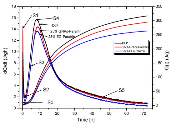 Figure 6 shows the heat of hydration along with the rate of heat of hydration dQ/dt of cement paste with 25% CPCM (EG-Paraffin and GNP-Paraffin) in the first 72 h. Six stages can be observed: (S0) rapid dissolution, (S1) first deceleration, (S2) induction or dormancy, (S3) acceleration, (S4) second deceleration, and (S5) slow continued reaction [34]. It can be seen that, during the first three hours, the hydration rates of CPCM cement paste are close to the control sample (without CPCM). From three hours onwards, the samples began to enter the acceleration period. Compared with that of the OCP, the heat-releasing rate in Stage S3 of the TESCP is lower and right-shifted due to the large thermal storage capacity of CPCM [30]. The high heat capacity of CPCM in cement pastes mainly results in a right-shifting phenomenon. It can also be observed that the hydration heat releasing rate during the first 72 h was lower, so thermal energy storage cement paste can be utilized in larger sections to reduce the temperature stresses, resulting from the heat of the hydration of the cement paste in the early stage and thereby decreased the early-age cracking. From this viewpoint, CPCMs are good in improving the durability properties of cement-based materials. Šavija and Schlangen [35] reported that latent heat energy storage capacity of microencapsulated PCMs helped in preventing volume changes and microcracks caused by thermal stresses in concrete. Hence, the application of TESCP into an energy pile would improve the thermal energy storage capacity and the durability of the pile structure. With the increase in the percentage of PCM contained by the carrier, the effect of PCM on the heat of hydration becomes greater. It is worth mentioning here that the rate and the amount of the heat of hydration are very important for structures having considerable mass.