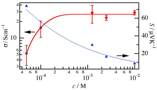 Conductivity σ// (red circles) and Seebeck coefficient S// (blue triangles) of the P3HT film treated with acceptor solutions with c ranging from 1.0 × 10−2 to 5.0 × 10−5 M. The solid and dotted lines are visual guides of σ// and S//, respectively.