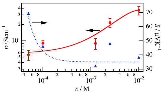 Conductivity σ// (red circles) and Seebeck coefficient S// (blue triangles) of the P3HT nanofiber mat treated with acceptor solutions with c ranging from 1.0 × 10−2 to 5.0 × 10−5 M. The solid and dotted lines are visual guides of σ// and S//, respectively.