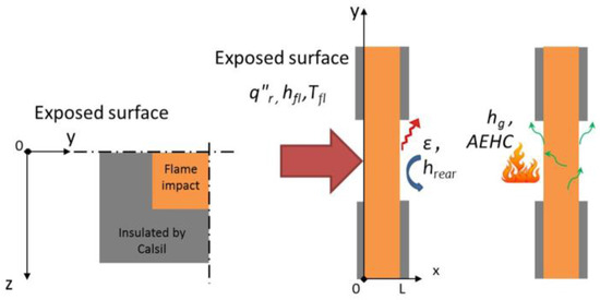 The strength of these previous models is that the heat flux condition at the impacted face was totally controlled (as MLCC [22], furnace test with the temperature increase which follows an ISO834 curve [23]). Thus, if the heat fluxes at the impacted and non-impacted faces are known, it is possible to predict the behaviour of the composite, but it is more complicated in the case of the direct impact of the flame on the composite.