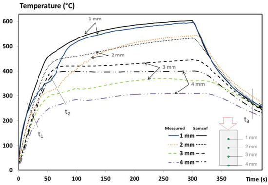 In terms of the numerical results, an excellent agreement of up to t1 (near 10–30 s) is observed between the predictions and measurements, owing to the high accuracy of the virgin inputs of T700/M21 implemented in the model and to the appropriate initial boundary conditions. Similarly, the temperature measured by the thermocouples placed at x = 1 and 2 mm are quite well predicted after 100 s and 150 s of test duration, respectively. For the thermocouple located at x = 3 mm, the prediction overestimates the measurement at around 100 °C. It might be assigned to the delamination phenomenon, but in our case, no significant delamination is shown since the material studied is a UD T700/M21 [1]. Each ply in a UD composite material is stacked in the same direction, decreasing the ply stresses between each one and decreasing the delamination effects. Therefore, this difference is not due to a lack of implementation of the delamination effect in the model. This discrepancy is rather explained by the overestimation of the flame heat flux between t1 and t2 reported in Figure 4. There is a lack of phenomena taken into account in boundary conditions as explained in the introduction section. This is discussed in the next paragraph. Moreover, the temperature measured at the rear face (x = L = 4 mm—Figure 4) is also overestimated due to the boundary condition at the exposed face and due to the lack of precision of the measurement. The temperature was measured using a pyrometer at the rear face of the composite with an emissivity being only estimated. The change of thermo-optical properties should be measured and taken into account in the model, which can be due to the modifications of material surface and/or the out-gassing. Consequently, the accuracy of the temperature measurement decreases.