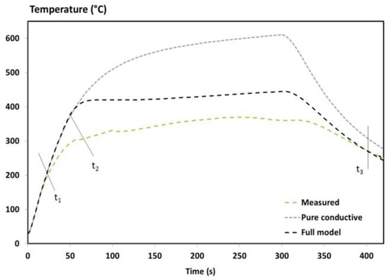 Furthermore, some inputs cannot be responsible for the overestimated temperature. Indeed, the first 30s was predicted by the model and, at 400 s – t3, the cooling rate of the temperature profiles is captured by the predicted results. These results validate the numerical implementation of the final emissivity as well as the final thermal properties (material totally degraded as shown on the tomographic image [1]) and the boundary conditions without interactions. It should be remembered that these interactions play a role in the boundary conditions at the exposed and rear face as long as there is out-gassing (Equations (9) and (12)). Even if uncertainties of the inputs influence the thermal response of the T700/M21 exposed to fire, they could be responsible for small discrepancies but not as much as observed in Figure 4. Indeed, the MLCC modelling case proved that when the inputs and the boundary conditions (without interactions) are well determined and known, the model accurately predicts the thermal response and mass loss of the T700/M21 [11]. Moreover, the influence of these interactions, i.e., positive feedback and out-gassing, in the previous model (MLCC) is not as important as the fire modelling case since the main difference between both modelling cases is (i) the incident heat flux (50 kW/m² vs. 116 kW/m²), (ii) a propane flame which can be interacted with the combustible gases released from the decomposition of the composite, and that (iii) the MLCC boundary conditions are better controlled compared to this fire test. In our experiment, the boundary conditions of the titanium plate have been verified without interactions. It makes sense that these discrepancies are mainly due to the determination of the boundary conditions: (i) a simplified formulation of the incident heat flux from the propane flame has been used and (ii) the changes of the incident heat flux from the propane flame, created by the interactions at the boundary-layer gases, are empirically taken into account.