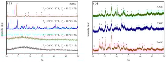 X-ray Diffraction (XRD) patterns of the RefGC after different post-heat treatments (a) and of AlGC, TiGC and ZnGC after the heat treatments at Tg + 20 °C for 17 h and Tp − 40 °C for 12 h (b). The following crystalline phases were identified: x Sr(PO3)2 [00-044-0323], + NaSrPO4 [00-033-1282], o Sr3P4O13 [04-015-2023] and ◊ Ti(P2O7) [04-012-4504].