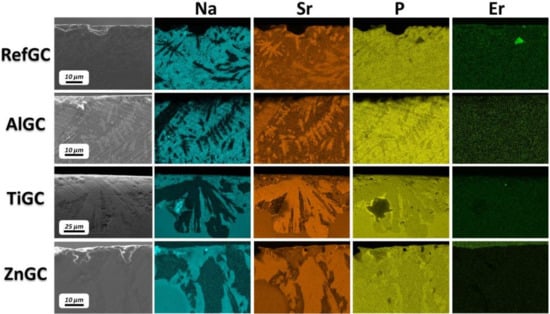 Figure 3 shows the Field Emission-Scanning Electron Microscopy (FE-SEM) micrographs of the cross-section of the GCs. The external surface of the samples, displayed at the top of the images, highlights evident signs of surface crystallization. The thickness of the crystallized layer rises with an increase in the duration of the post-heat treatment, in agreement with the results reported in []. Interestingly, the RefGC exhibits the highest crystallization rate: after 2 h at Tp − 40 °C, large crystals can be evidenced in the RefGC, while crystallization appears to have occurred to a significantly lesser degree in the other GCs. The crystals precipitating in the RefGC and AlGC seem to grow dendritically with split ends, whereas in the case of TiGC and ZnGC the crystals show rounded borders. Additionally, as reported in Figure 4, the Energy Dispersive Spectroscopy (EDS) mapping of the GCs post-heat treated at Tp − 40 °C for 12 h clearly shows Sr-rich crystals surrounded by Na-rich crystals. The Sr-rich crystals seem to have a lower P content than the Na-rich ones. The Er3+ ions seem to be homogeneously distributed in all the glass ceramics, but their concentration is probably too small to show clear variations.